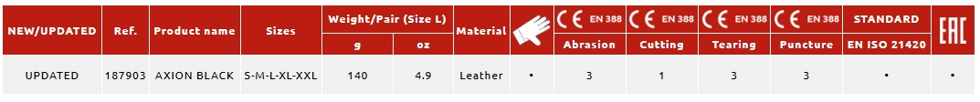 Premium grade leather gloves designed for maximum durability and dexterity with work on ropes. The palm features two layers of leather with aramid stitching. Elastic inserts on the back optimize flexibility. Soft rubber padding on the knuckles for protection from impacts. Neoprene cuff with Velcro closure. CE EN 388 certified for mechanical risks (protection values: abrasion 4, cutting 1, tearing 3, perforation 3). Available in 5 sizes: S, M, L, XL, XXL.