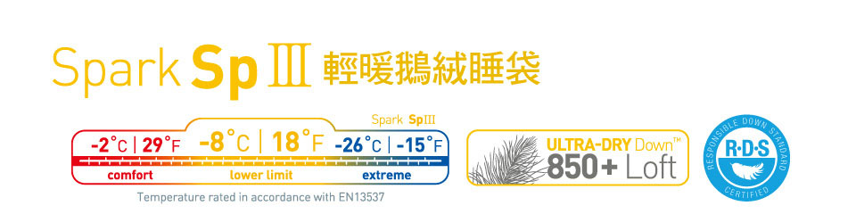 極輕及具技術性的SparkTM 系列睡袋,讓你在打包時,同時兼顧輕量化與保暖。