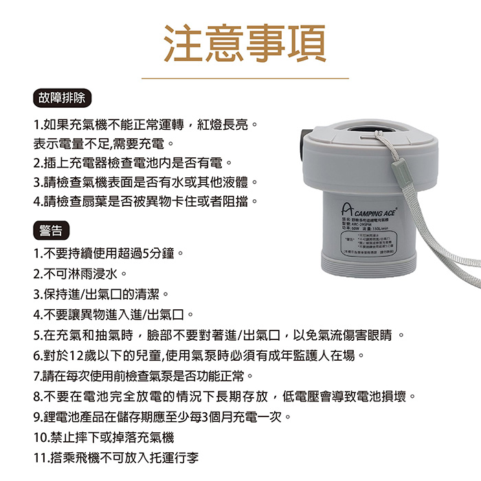 - 配件: 雙向轉接頭*1 充氣床接頭*1 充氣玩具小接頭*1 Type-C充電線*1