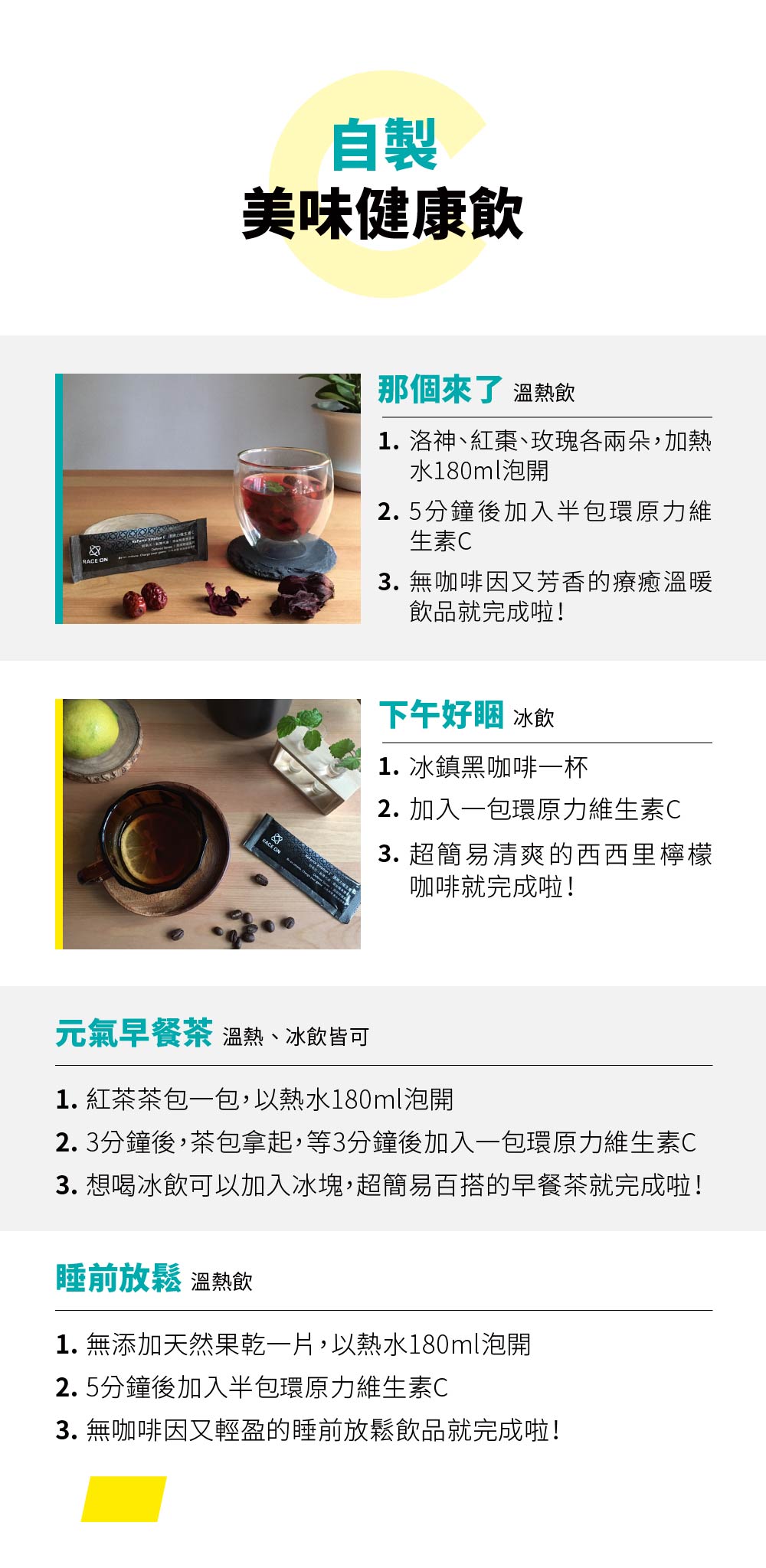 A:將粉末與水沖泡後直接飲用,維生素C因具抗氧化作用,且有助於體內結締組織生長,為運動恢復的重要營養素,建議可於強度訓練及賽事前後使用,原則上不分時段皆適合使用。