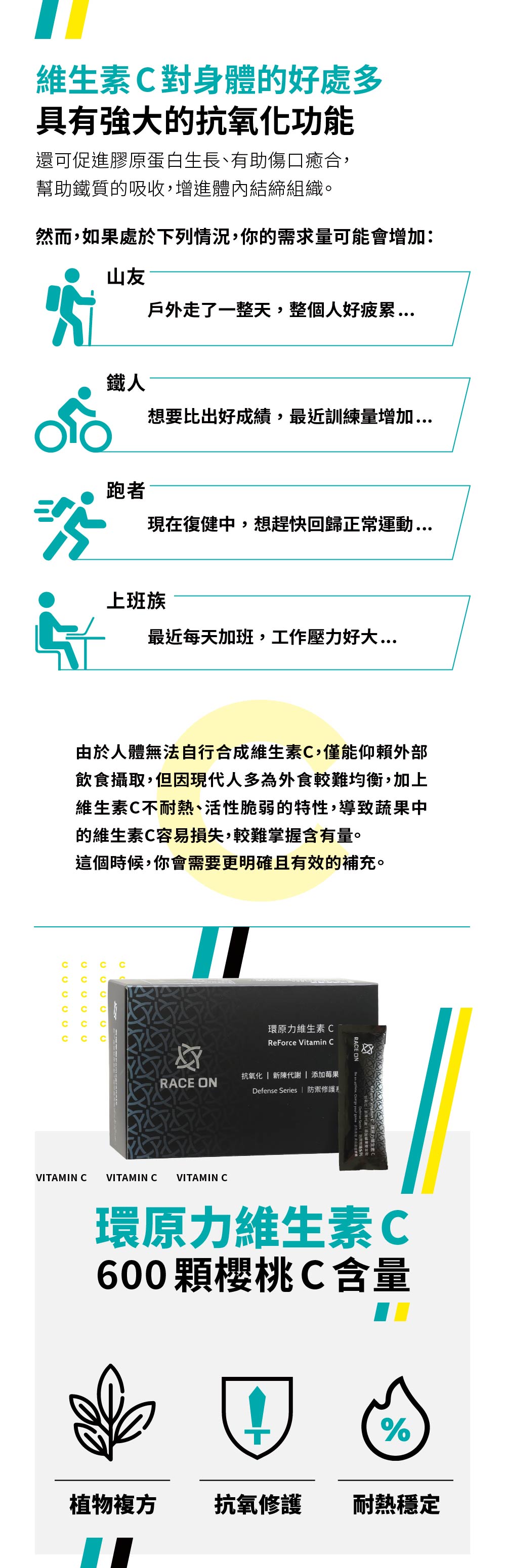 加強恢復,減輕隔日負擔。抗氧化修護,掃除運動後的壓力。彌補蔬果不足,提升保護力。
