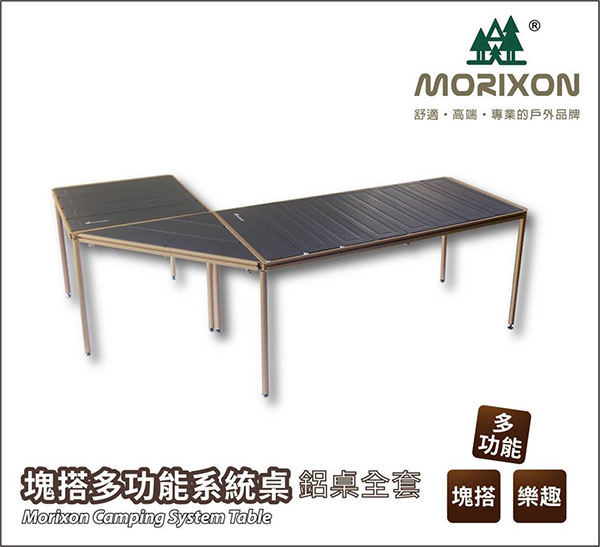 『Morixon 塊搭多功能系統桌』具有桌面四邊有延伸功能和系統化設計,可藉由戶外休閒活動中來陸續添購需要的塊搭桌配件,不僅僅只是一張休閒桌,而是一個具有外擴性的系統化產品。無桌角滑槽的專利設計,四邊都可做多方面應用,可搭配各種滑塊,延伸桌板面積、如營燈桿架、毛巾架、置物架等等,桌板多樣化設計更能依照不同用途搭配不同的桌板材質,在使用上以藉由不斷延伸組裝的概念,將桌子賦與多重用途,可搭配不同模組件,擴展使用便利性,輕便、多樣化性能滿足戶外活動者需求,打造舒適便利的休憩空間。