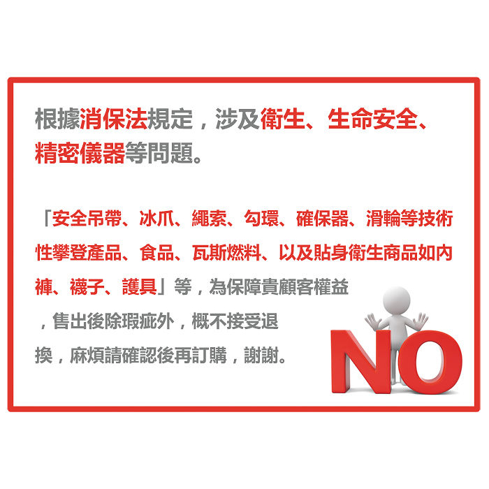 ※根據消保法規定,涉及衛生、生命安全、精密儀器等問題,「安全吊帶、冰爪、繩索、勾環、確保器、滑輪等技術性攀登產品、食品、瓦斯燃料,以及貼身衛生商品如內褲、襪子、護具」等,為保障貴顧客權益,售出後除瑕疵外,概不接受退換,麻煩請確認後再訂購,謝謝。(如為商品本身暇疵除外,謝謝您!)