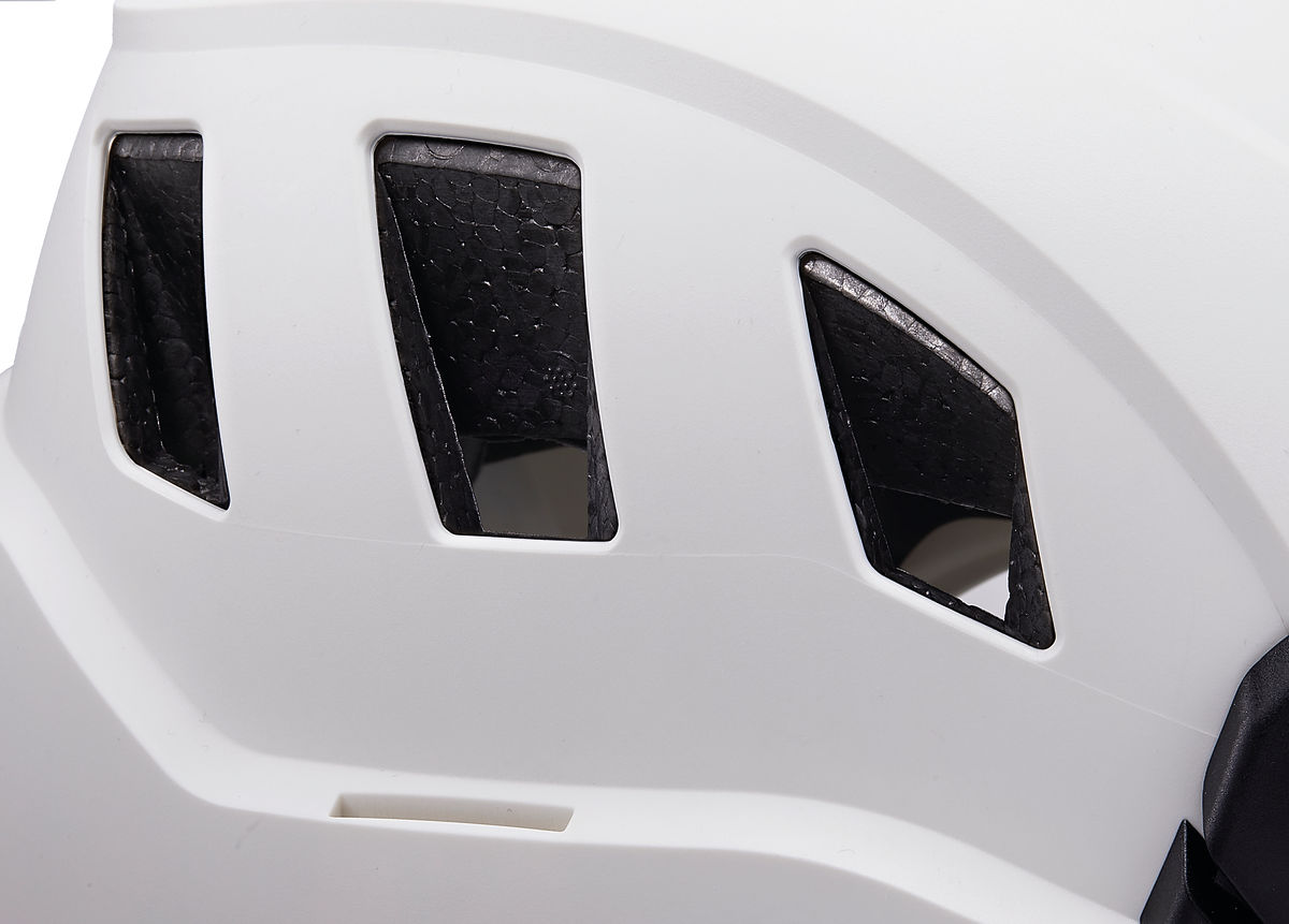 可調強度的下巴帶非常適合在高處和地面上作業。它具有通風孔,可讓氣流通過頭盔。