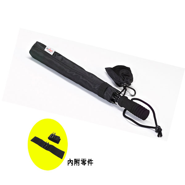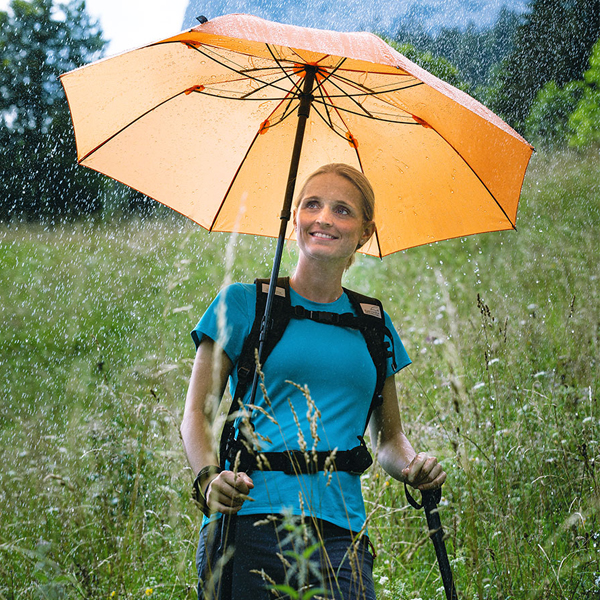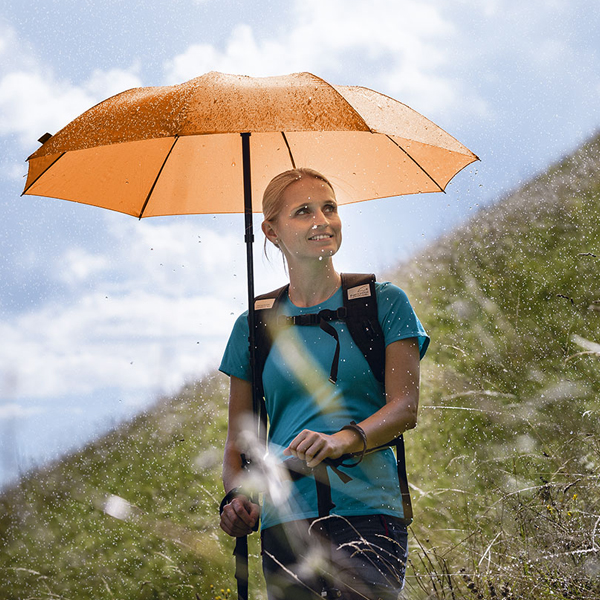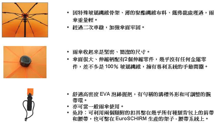 特色 : 「 免持傘 」 是那些需要在雨中自由活動者人的理想選擇:適合徒步旅行者使用登山杖以及林務員、園丁、賞鳥者或自然攝影師。特別亮點:玻璃纖維傘柱可伸縮至 96 公分,可扭轉固定在任何高度,以匹配主人的身高。 借助於兩個附帶的扣具,傘的握把可以固定在背包肩帶的左右邊,左、右或沿對角線固定到背包胸部的肩帶上,可定位在雨或太陽的方向。折疊在一起時,傘很短,很容易放入背包或包裡。另一個優點:免提口袋徒步旅行傘也可以像城市和日常生活中的普通傘一樣使用。