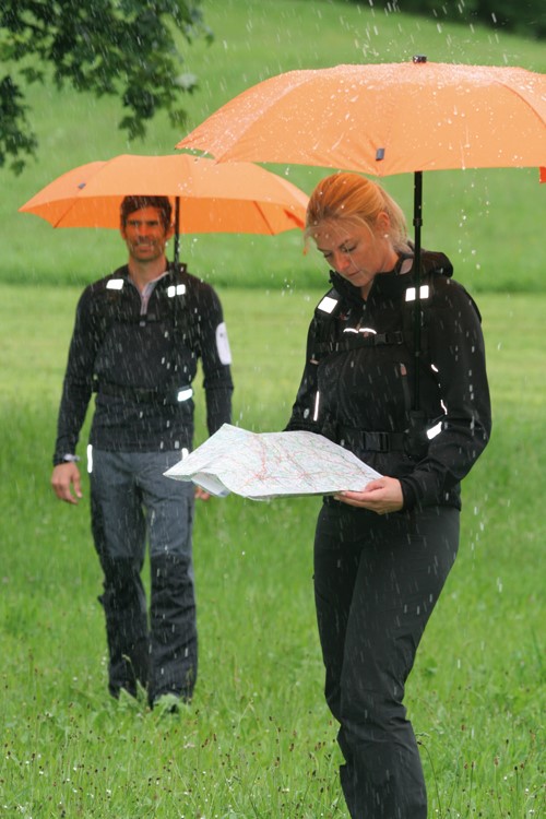 使用腰帶,雨傘可輕易扣緊在任何標準背包上;或是可繫在EuroSCHIRM生產的架子-腰帶系統上。兩隻手可完全空出來,下雨天時可讓健行者拿登山杖、換鏡頭、使用GPS、查看地圖等。而且當嬰兒坐在爸媽背的背架裡或胸前時,不論是擋雨或遮陽都非常有用。