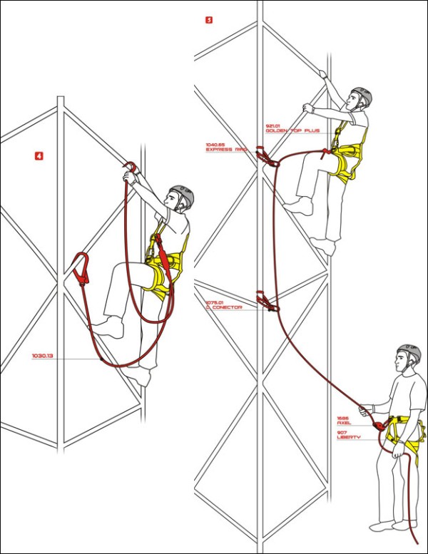‧圖7:攀登完成後,使用一條可調長度的挽索來定位工作位置。並架設一條安全繩,連接墜落制停裝備到工人的安全吊帶。