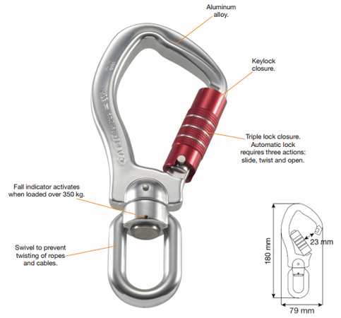 鋁合金鉤環配有旋轉接頭,可防止繩索扭轉纏繞。