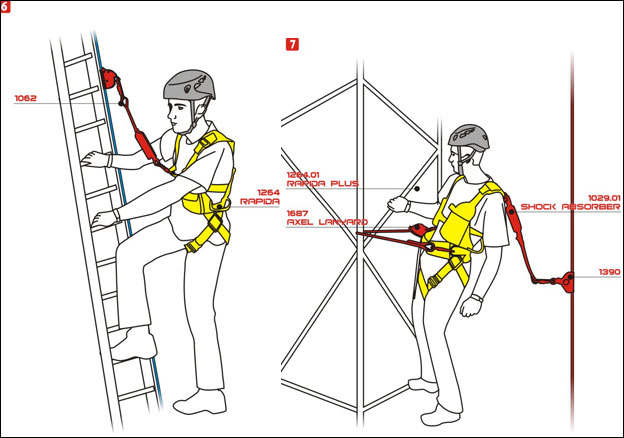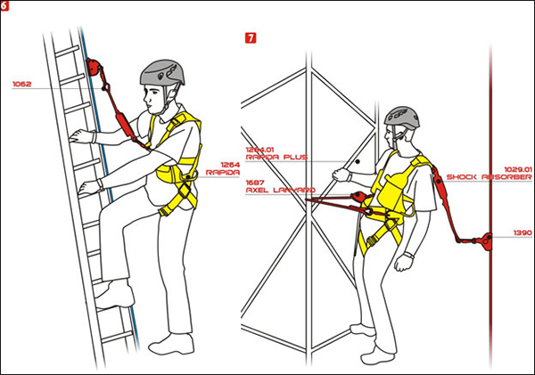 ‧圖6:在裝設有垂直鋼索的地方前進時,使用墜落制停裝備及勢能吸收器。