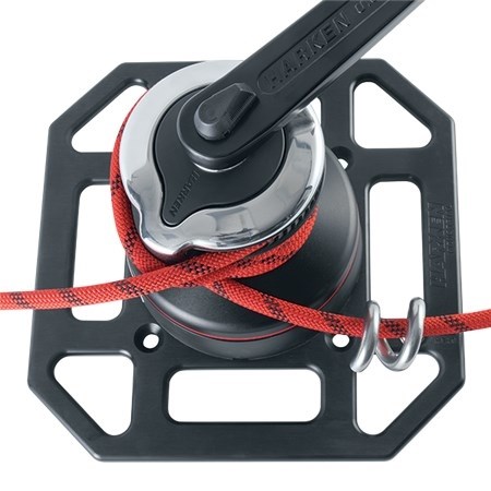 Traction Winch 500型套組內容包括:通用安裝固定板、40.2 Harken 絞盤和 Harken 10”旋轉手把。