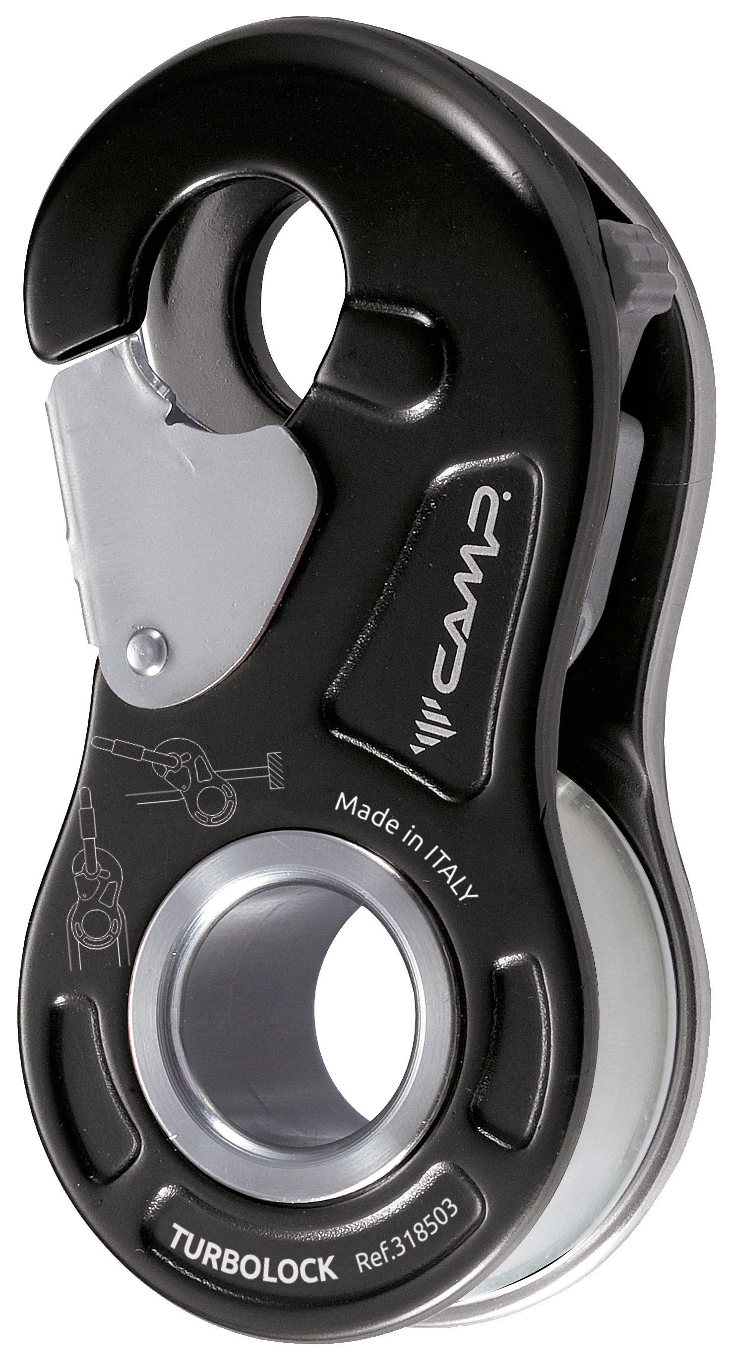 The Turbolock is a progress capture pulley designed to be exceptionally compact, robust and efficient. Specifically contoured for operation with one hand. The locking mechanism for opening and closing allows the rope to be inserted without removing the device from the anchor and it cannot be opened when the pulley is loaded to prevent accidental openings during use. Toothed cam is designed for an immediate and strong grab on ropes from 8 to 13 mm. The cam is enabled and disabled with a switch that is protected inside the flanges to prevent accidental activations. One movement to open the cam for easier insertion or removal of the rope or to use the device as a non-locking simple pulley. Two movements to enable the cam. The two attachment points (main attachment point and the becket hole) allow for the full rotation of carabiners for maximum ease of use. Large diameter sheave with sealed ball bearings for very high efficiency (95%). Robust construction features hot forged side plates, precision milled aluminum alloy sheave, and stainless steel cam, rivets and pins.