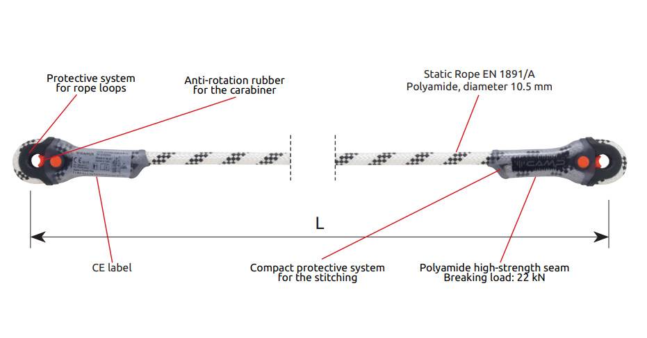 - 固定長度定位掛繩由10.5mm 靜態繩索製成。