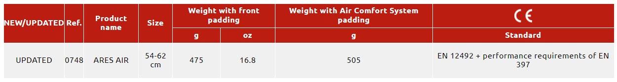 | 0748-8 | ARES AIR 54-62 cm - Black | 475 | 16.8 | EN 12492 + performance requirements of EN 397 | • |