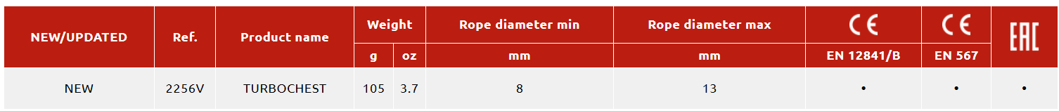 A revolutionary chest ascender that features two rollers for a smooth interface with the rope. This not only helps with climbing efficiency by making the upward glide much smoother. It also reduces dangerous wear and tear on the device where the rope tends to rub on the body of a traditional ascender. The perfectly profiled closure keeps the rope in line with the body of the device and the rollers to prevent the rope from escaping the device during tight pendulums and traverses. Self-cleaning holes on both the body and the cam help prevent the build up of grit and grime. Thicker body plates and a shaped connection point reduce wear on the device caused by shifting between the device and the connector (especially when used with steel connectors). This also keeps the device more in line with the body during use. The opening mechanism is simple and secure with the ability to lock the device open for easier attachment and a removable pull cord that makes it easier to operate while wearing gloves. The proprietary rollers also allow the Turbochest to be rigged as a locking pulley for light hauling with a max load of 50 kg, 110 lbs. NOTE: This configuration is not intended for hauling or securing of bodies.