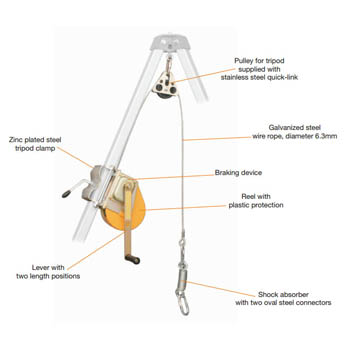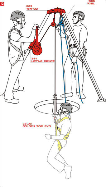 Confined spaces present high levels of risk for workers. A tripod (EN795) with a lifting device EN1496 must be used so that a worker can be quickly rescued in the event of an accident. A secondary safety rope with an auto-locking descender is required (fig. 12).侷限空間比高空作業帶給工人更高的風險。用一個三角架(Tripod, EN795認證)作為固定點,具備鋼索捲揚器(EN1496認證),以備工人在發生意外時可以快速的將他救上地面。必需架設另一條安全繩(靜力繩,EN1891)通過一個自動制停的確保器,由地面上一位確保員收放繩索,以防止工人墜落。