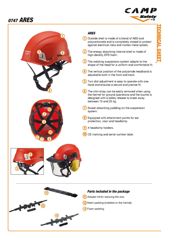 | 0747 | ARES | 54-62 cm | 470 | 16.6 | EN 397 + LD + 440 V a.c.+ -20°C + MM | • | • | • |