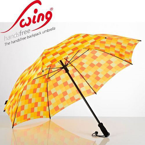 這把特別的雨傘強調它的伸縮玻璃纖維柄,可變化延伸到超過1公尺長度,利用一個小扭轉動作即可固定在任何高度。藉由兩個隨附的扣具去固定背包上的2個帶子,根據風和雨的方向可固定在右邊、左邊。雨傘握把的彈性環可彈性固定在腰帶上。