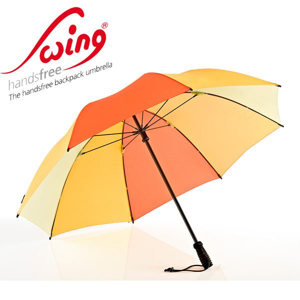 這把特別的雨傘強調它的伸縮玻璃纖維柄,可變化延伸到超過1公尺長度,利用一個小扭轉動作即可固定在任何高度。藉由兩個隨附的扣具去固定背包上的2個帶子,根據風和雨的方向可固定在右邊、左邊。雨傘握把的彈性環可彈性固定在腰帶上。