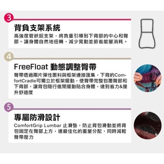 專利的FreeFloat臀帶和活動式肩帶在行進間能隨著行走步伐擺動&調整,帶來優良的舒適度。