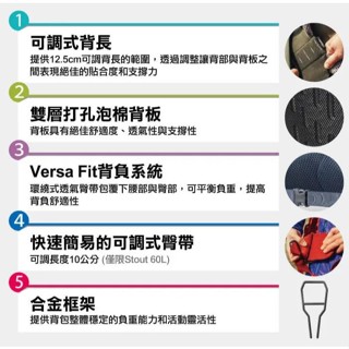 VersaFit可調式背長懸掛系統,可調整至最適合個人尺寸保持舒適的背負狀態