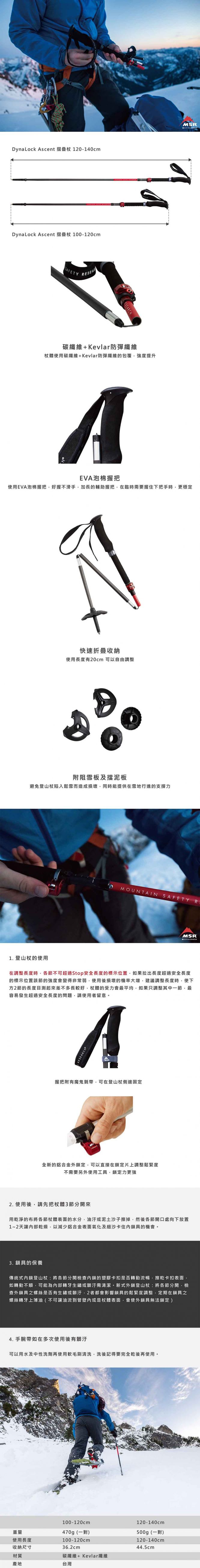 減少登山杖的收納體積,S號的收納尺寸約36.2cm甚至可以放入單日郊山背包內。DynaLock Ascent摺疊杖的杖體,使用碳纖維再包覆Kevlar防彈纖維,強度好,可以達到雪地健行的使用等級,一般市場上的摺疊登山杖都會特別標明不適合雪地健行使用(強度及阻雪片的問題)。全新的鋁合金外鎖定,可以直接在鎖定片上調整鬆緊度不需要另外使用工具,鎖定力更強。(產品內附阻泥板及阻雪板,可依不環境換裝