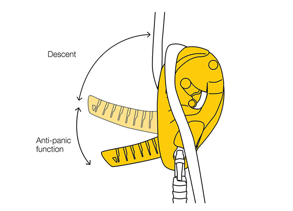 - 符合人體工程學的手柄可以釋放繩索,並可以舒適地控制下降。兩種可能的下降模式:在側板上或在V形摩擦通道中