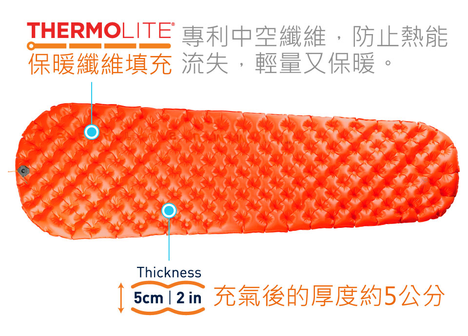 THERMOLITE® 保暖布料,利用科技元素將布料做到輕量化,並且達到最棒的 CLO Value ( 隔熱值)。Sea to Summit 利用 THERMOLITE® HL-1 來做填充, 利用其特殊的 3D 中空且堅固的波紋狀構造,提供最棒的保暖度、輕量化與耐用度。透過 Air Sprung CellsTM - 獨立氣筒的構造,將 THERMOLITE® HL-1 保暖材質包覆在內,以降低身體熱能與地面寒冷濕氣對流所造成的能量耗損,提供使用者一定的保暖度。輕量舒適系列睡墊中的加強版款式,都應用的上述兩項科技布料,來提供最好的保暖度。