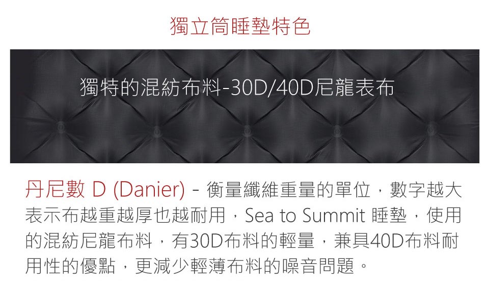 來自澳洲最佳戶外裝備 Sea to Summit,追求更輕量、更耐用、更符合戶外活動的需求,帶給您戶外活動最棒的睡眠品質。Sea to Summit 致力於研發出一款優於市面上現有睡墊更棒的款式,這樣的企圖心驅使 Sea to Summit 成功研發出世界上即為輕巧、方便攜帶的全系列睡墊新品!探究為什麼 Sea to Summit 能設計出如此切合戶外活動中所需要的產品,只因為在乎每次在戶外過夜的睡眠品質。Sea to Summit 非常榮幸能帶給戶外活動喜愛者如此卓越的商品,助您一夜好眠!
