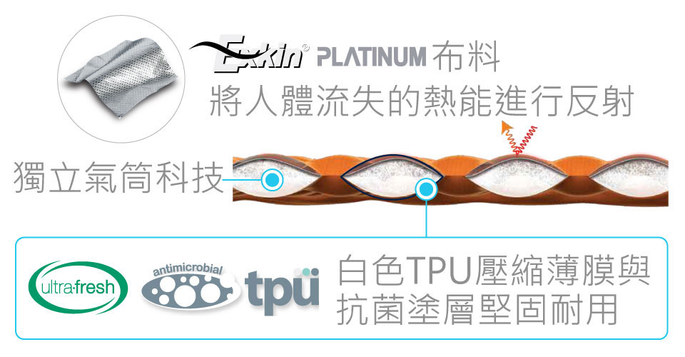 Exkin Platinum® 布料,是一種極為輕量的不織布,表布加上了一層薄薄的金屬材質,可將人體於靜止狀態中不斷流失的熱能,再次反射回饋至使用者身上,透過循環提供溫暖。