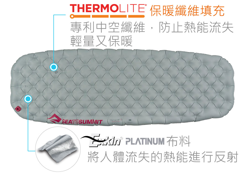 THERMOLITE®保暖布料,利用科技元素將布料做到輕量化,並且達到最棒的CLO Value(隔熱值)(註)。Sea to Summit利用THERMOLITE® HL-1來做填充,利用其特殊的3D中空且堅固的波紋狀構造,提供最棒的保暖度、輕量化與耐用度。透過Air Sprung Cells™-獨立氣筒的構造,將THERMOLITE® HL-1保暖材質包覆在內,以降低身體熱能與地面寒冷濕氣對流所造成的能量耗損,提供使用者一定的保暖度。(註:CLO Value是只在是溫21度C、相對溼度不超過50%、空氣流速不超過10cms的條件下,一個人靜坐保持舒適狀態時衣服所需要的隔熱值。)所有睡墊系列中的加強保暖款式,都應用的上述兩項科技布料,來提供最好的保暖度。