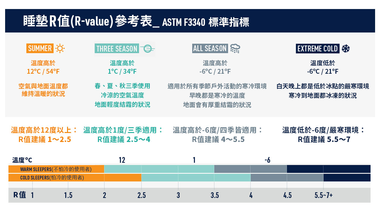 睡墊R值代表熱絕緣物質的 thermal resistance (熱阻),材質的R值越高,表示熱度越不容易穿透流失,就越適合作為保暖材料。R值和材料厚度也有關,同一材質的睡墊愈厚就愈保暖(重量也愈重)。睡墊R值參考標準:(僅適用於依照美國ASTM規範所測量出的R值)